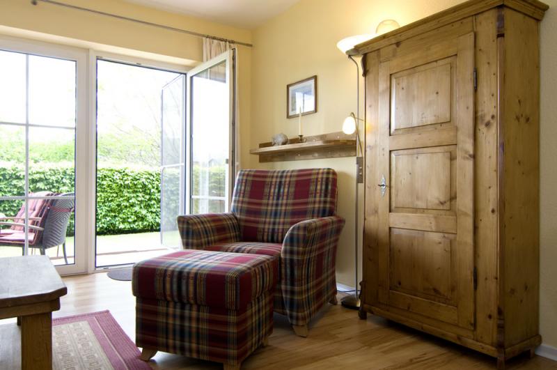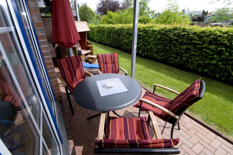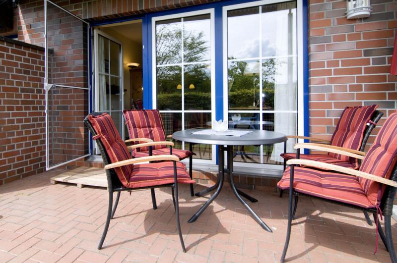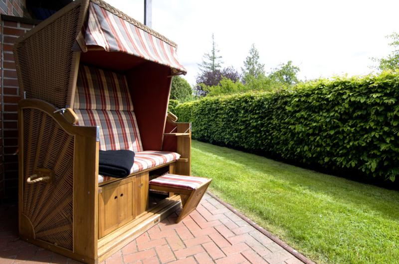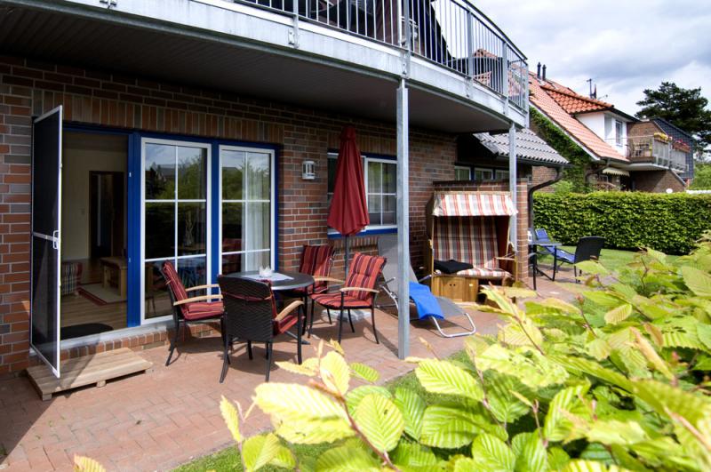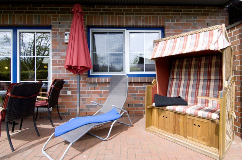 - Terrasse mit Terrassenmöbeln und Strandkorb