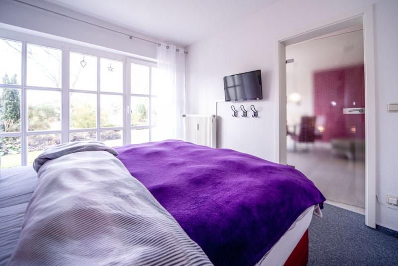 - Schlafzimmer mit hochwertigem Boxspringbett, Kopf- und Fußteil elektrisch verstellbar, Sat-TV und viel Stauraum