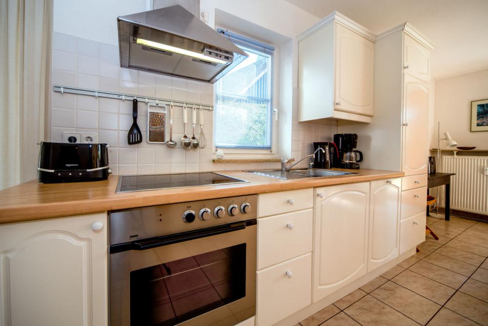 - gut ausgestattete Küchenzeile, Herd mit Ceranfeld und Backofen