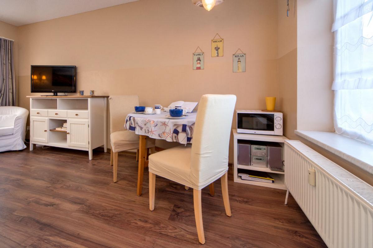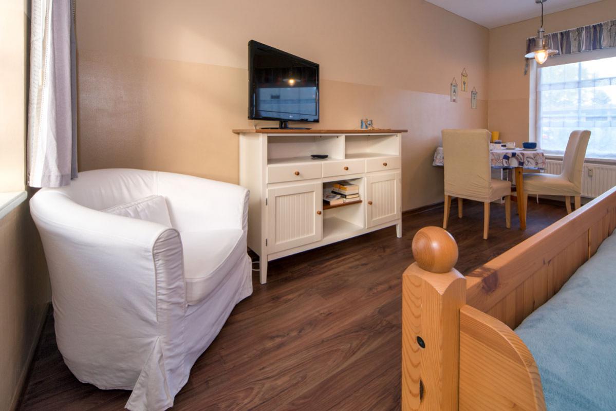 Unsere Ferienwohnung "Spatz" ist ein gemütlich eingerichtetes 1-Zimmer-Appartement mit kleiner Einbauküche, Doppelbett und gemütlicher Sitzecke. Im Garten steht für Sie ein Tisch mit Stühlen bereit.