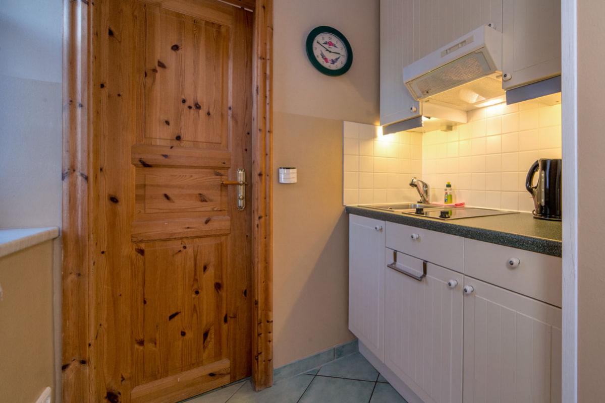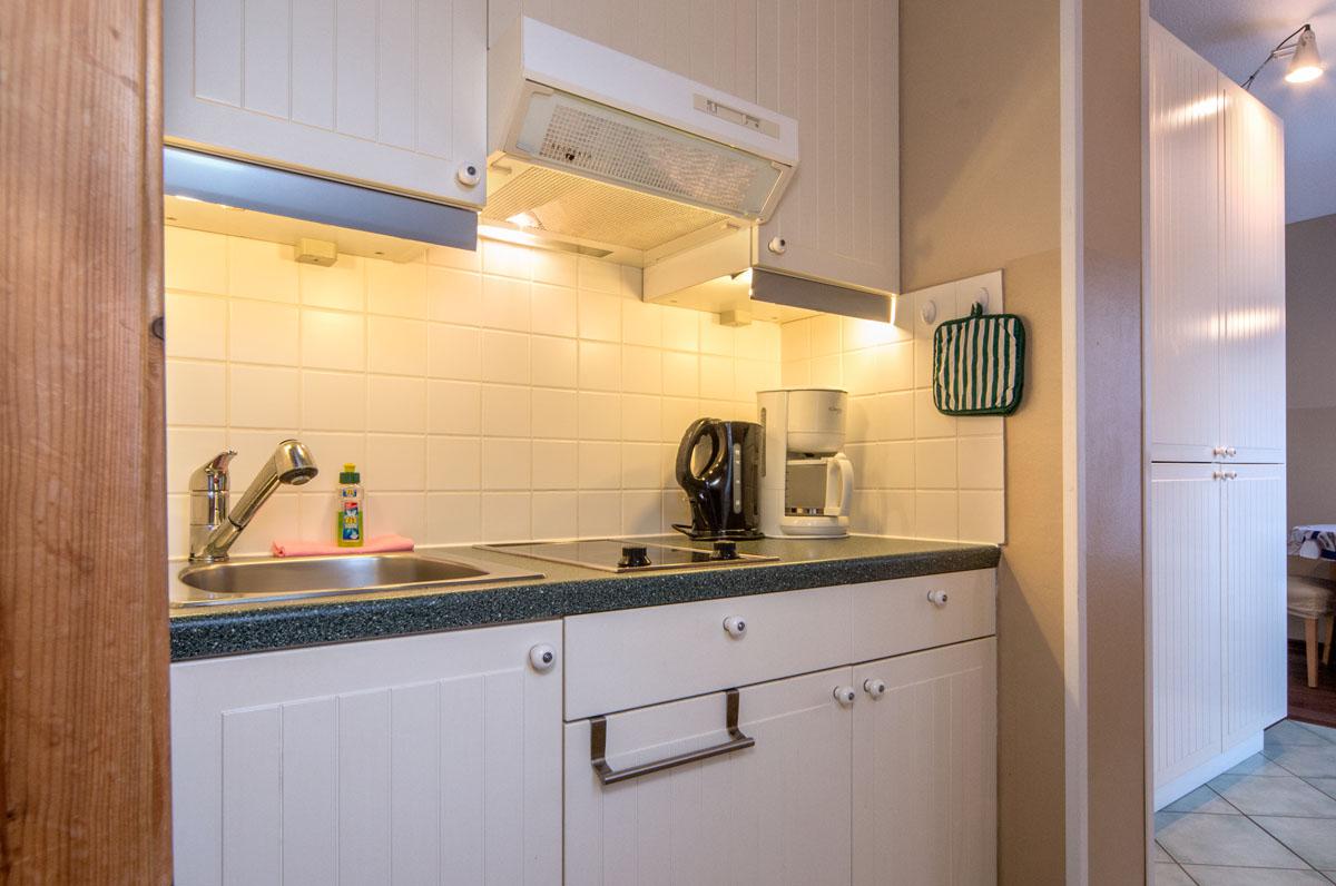 - Mini-Küche mit 2-Platten-Herd, Kühlschrank mit Gefrierfach, Mikrowelle, Kaffeemaschine, Toaster und Wasserkocher