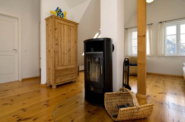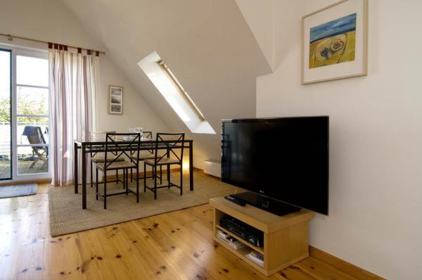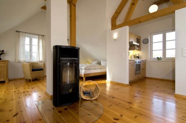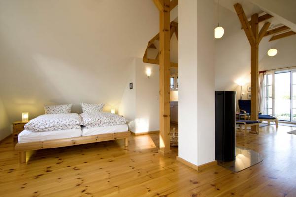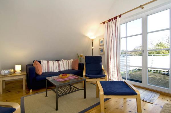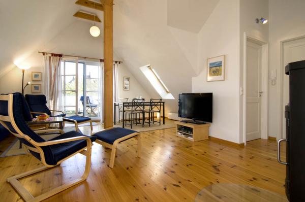 Dieses großzügige, liebevoll ausgestattete Einraum-Appartement mit sonnigem Fachwerkgiebel lädt ein zu gemütlichen Stunden zu zweit. Von der großen 20 qm-Sonnenterrasse haben Sie einen romantischen Ausblick über den großen Garten zum Bodden.