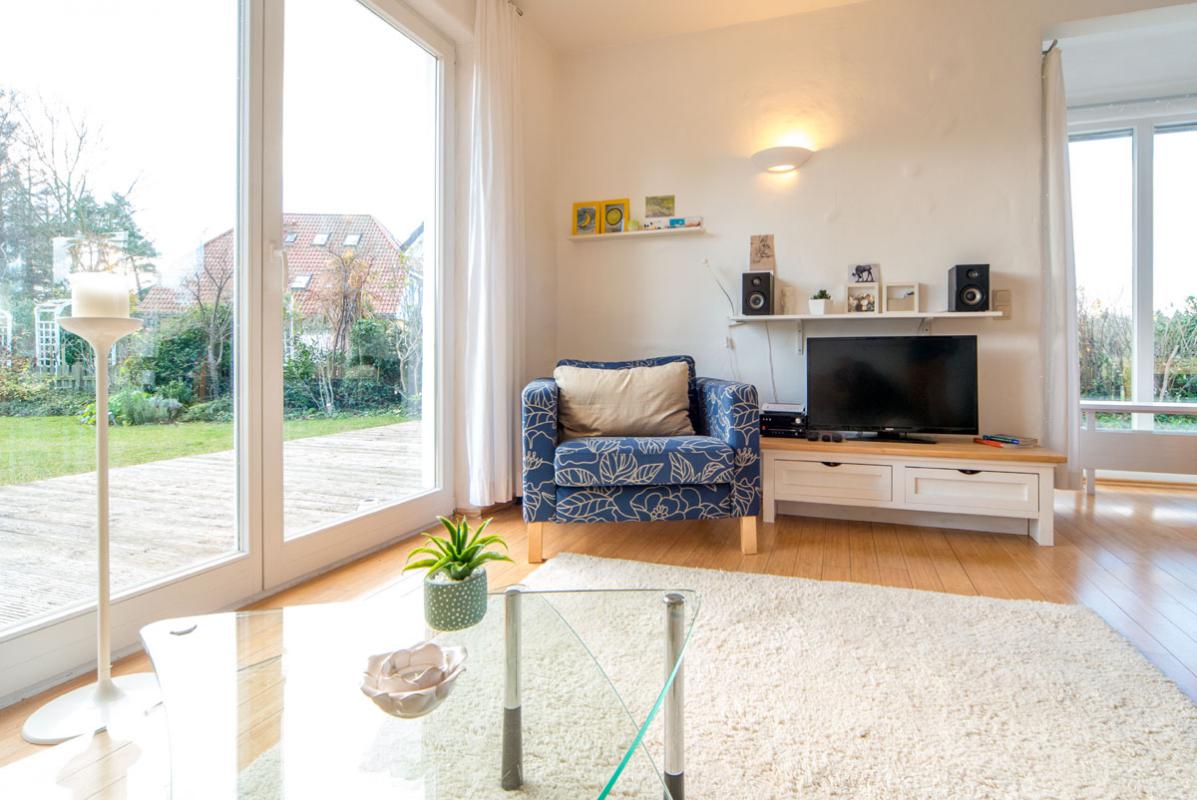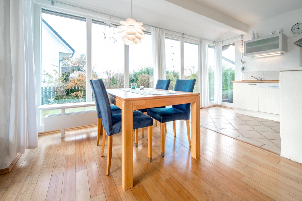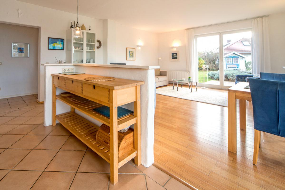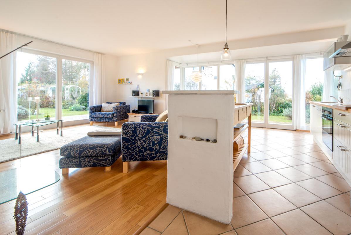 Der großzügige lichtdurchflutete Wohnraum mit Kamin, Essplatz und offener Küche beeindruckt durch die großen Fensterfronten. Sie geben den Blick auf die Terrasse frei. Für Aktive: Der Reiterhof und der Erlebnishof "Gut Darß" mit Kletterwald und Minigolf sind in der Nähe.