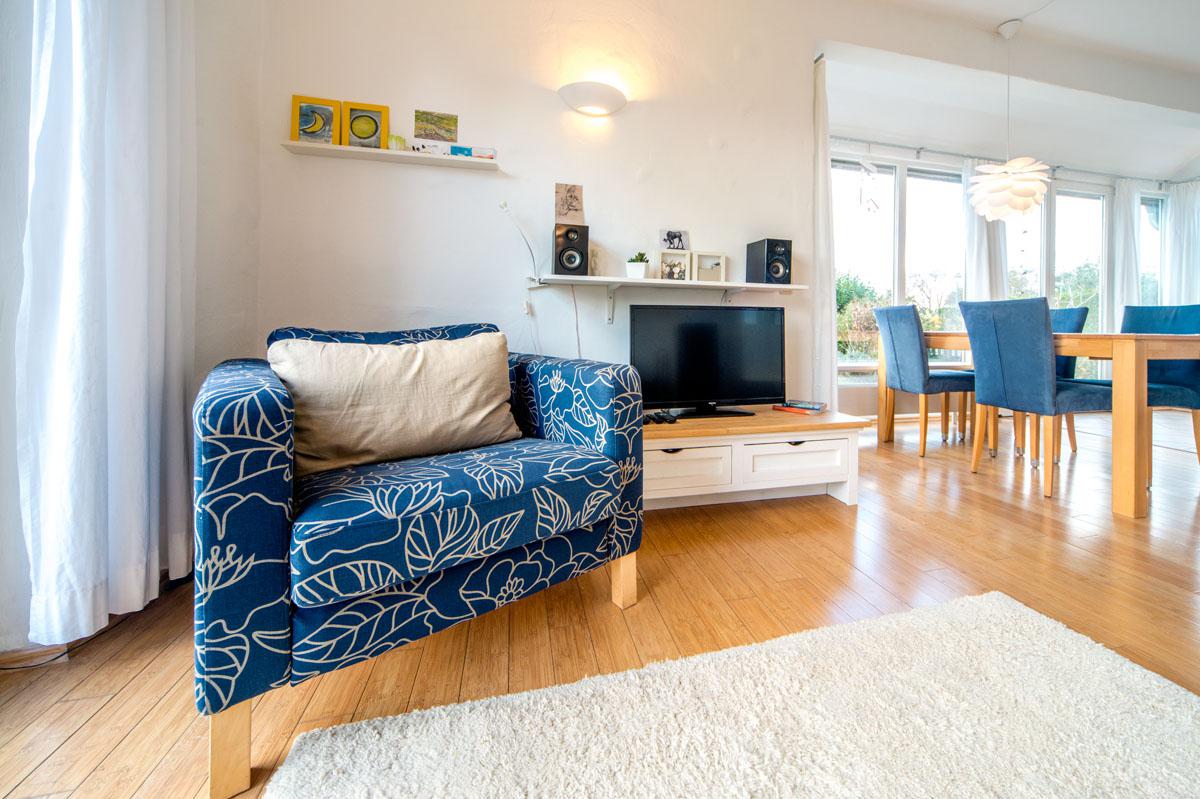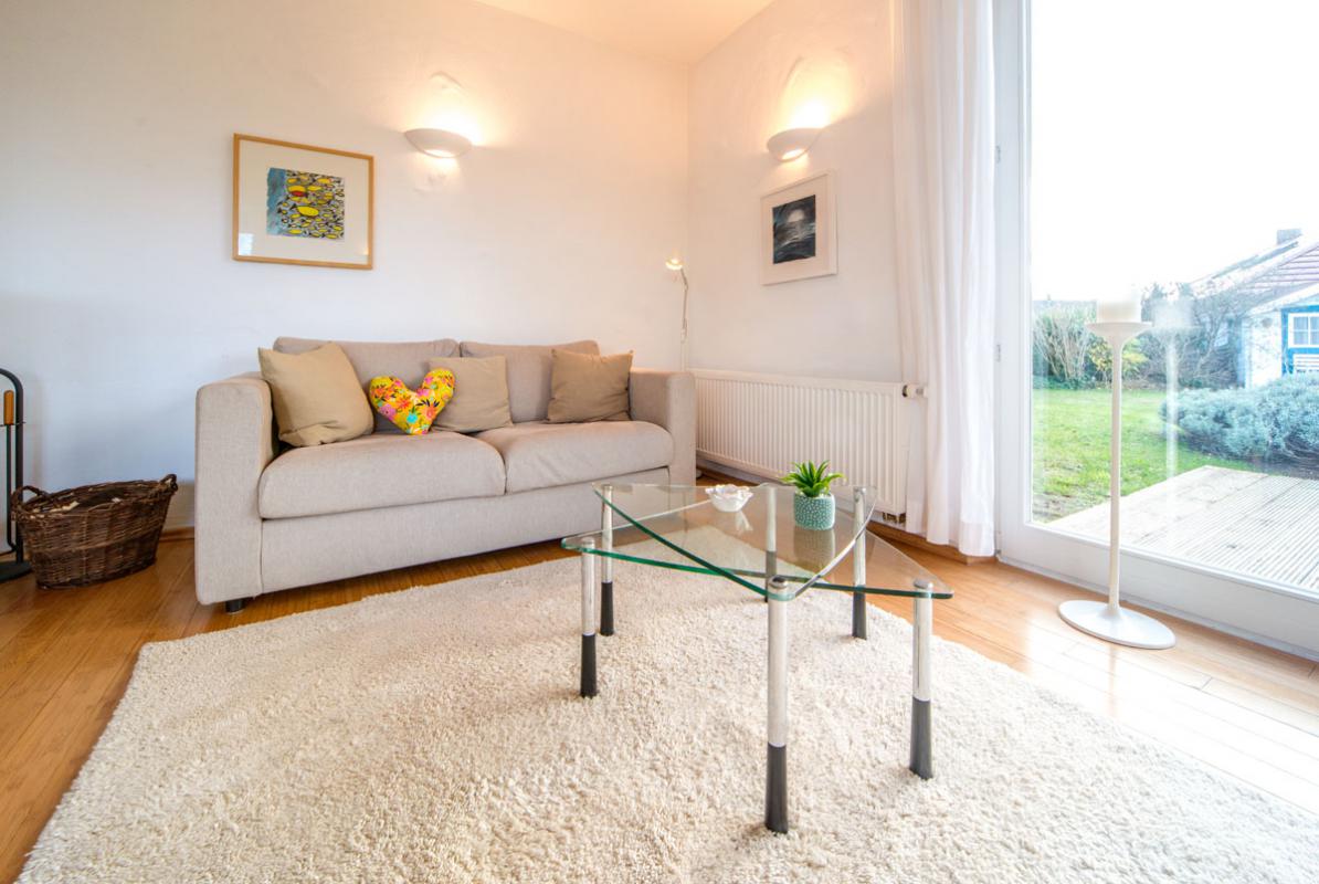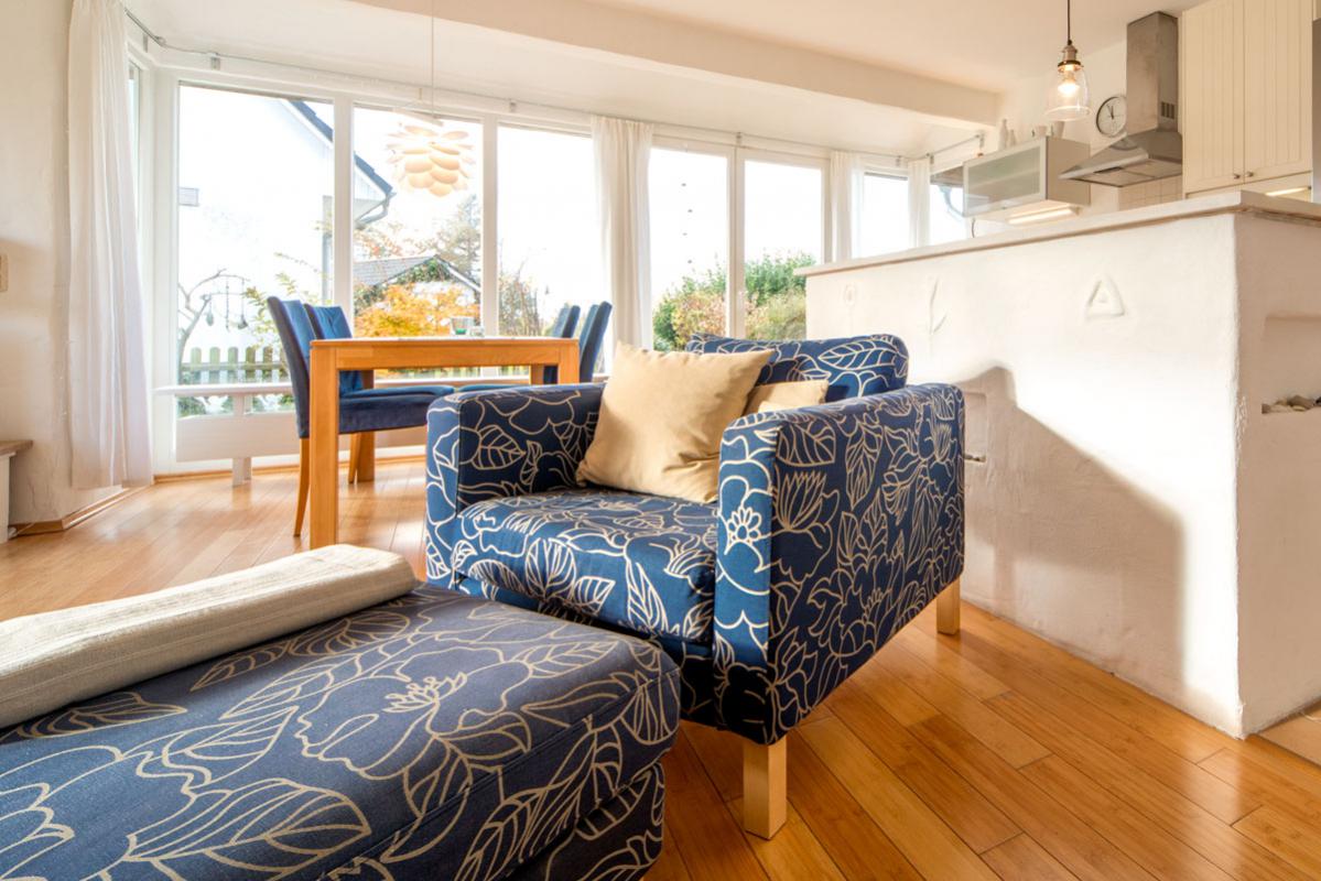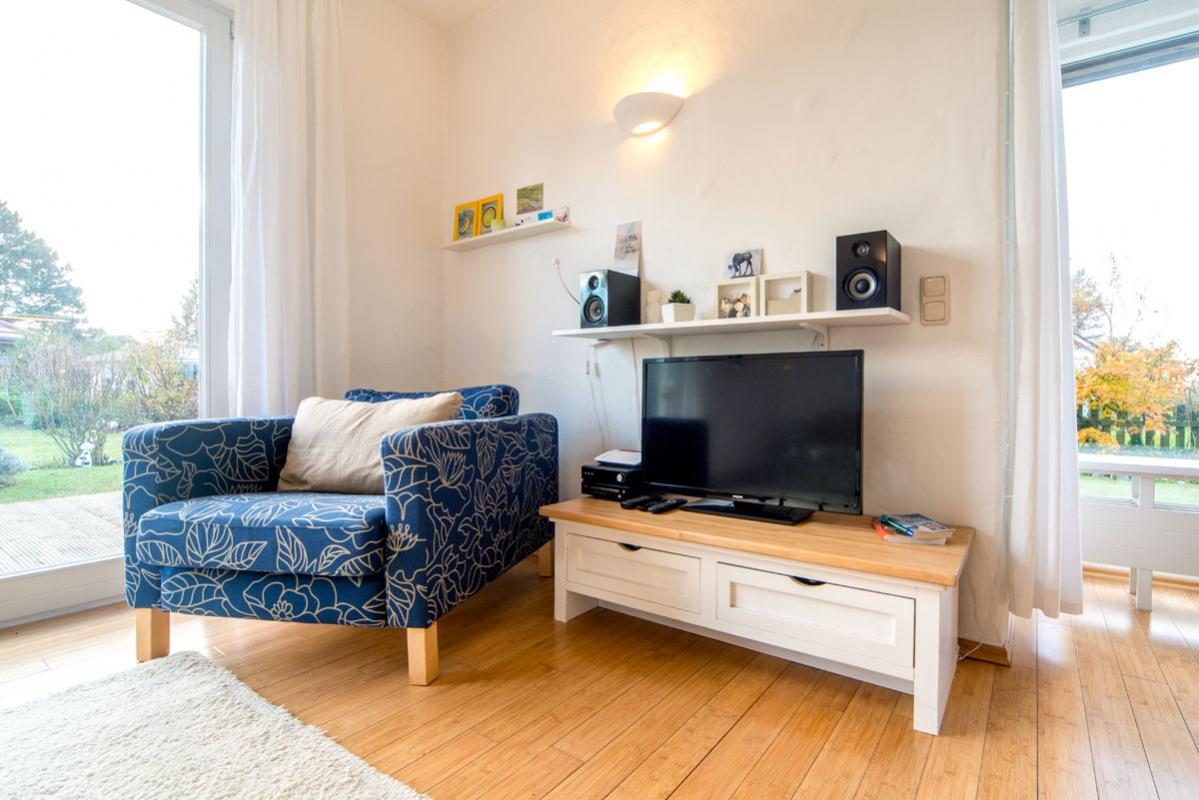 Der großzügige lichtdurchflutete Wohnraum mit Kamin, Essplatz und offener Küche beeindruckt durch die großen Fensterfronten. Sie geben den Blick auf die Terrasse frei. Für Aktive: Der Reiterhof und der Erlebnishof "Gut Darß" mit Kletterwald und Minigolf sind in der Nähe.