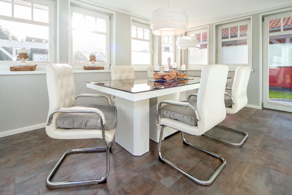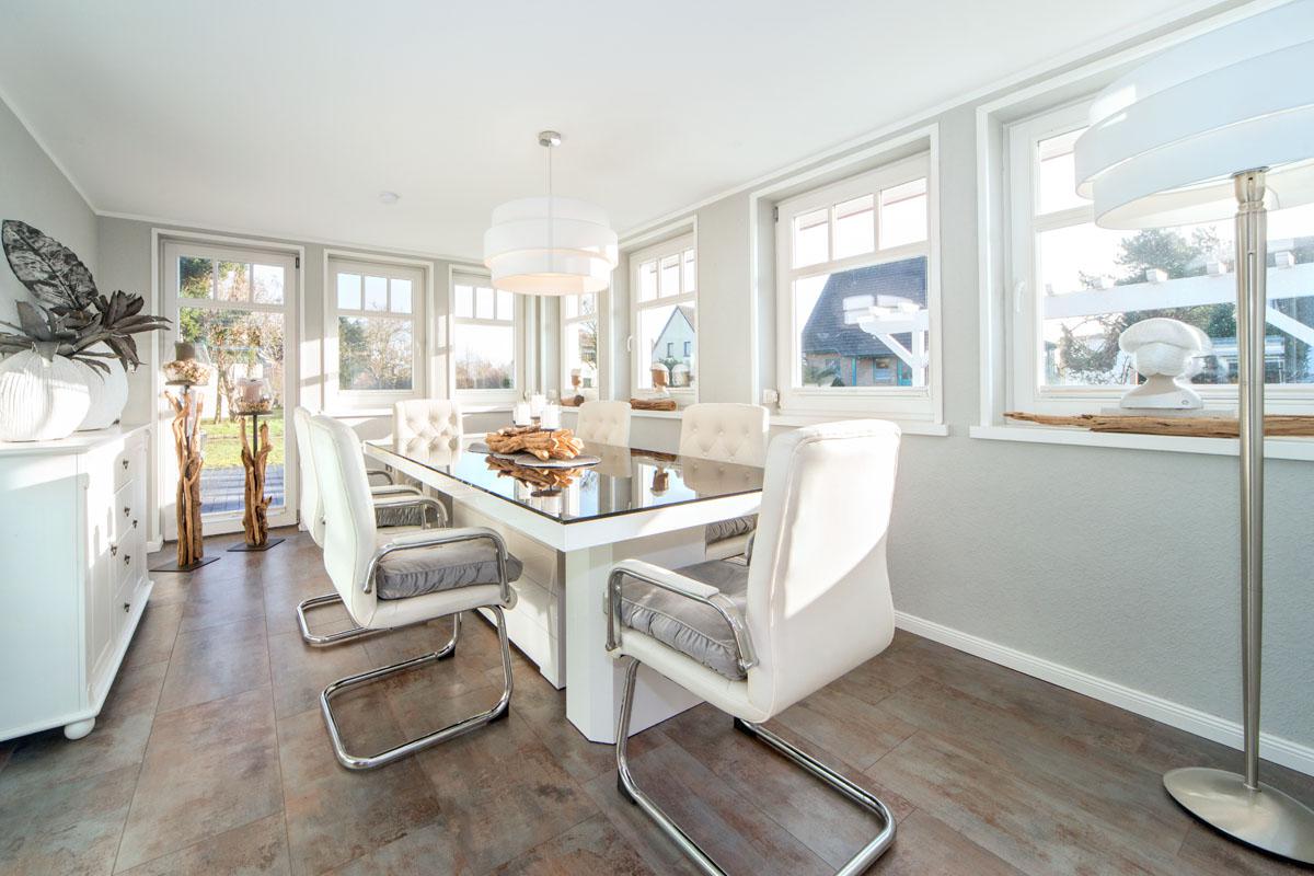 - helle Veranda mit großem Esstisch