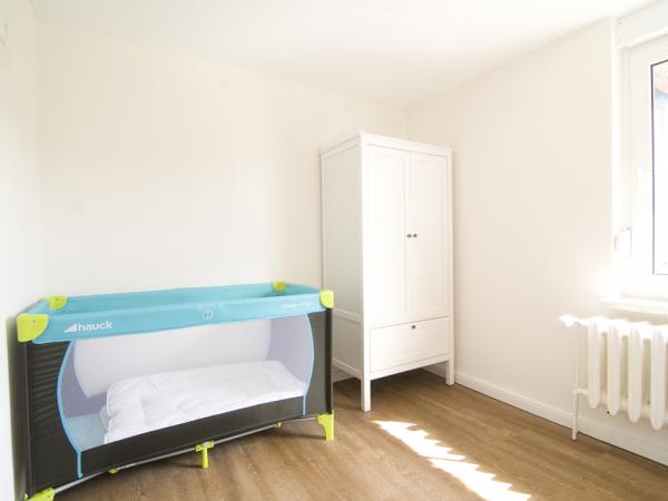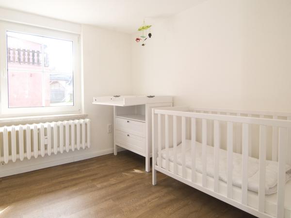 - ein Schlafzimmer im EG mit Boxspring-Doppelbett 200x180 cm, daran anschließend Kinder-Schlafzimmer mit 2 Kinderbetten und Wickeltischkommode